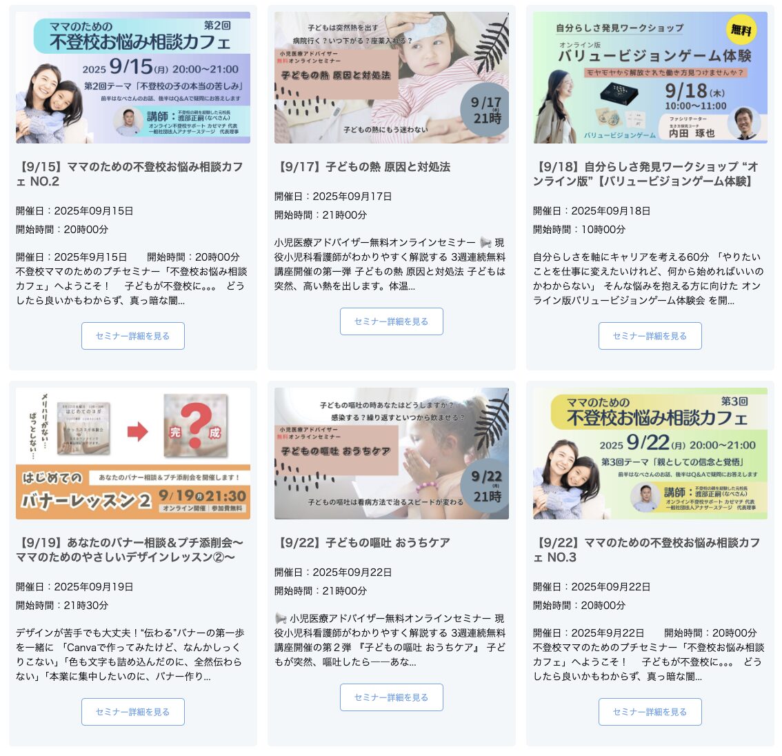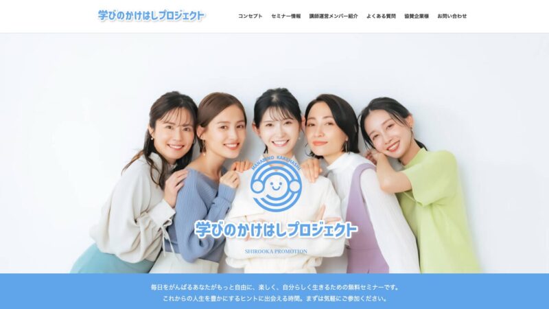 学びのかけはしプロジェクト公式サイトのトップページでは、子育て世代の親の悩みを解決するための複数のセミナーが紹介されています。